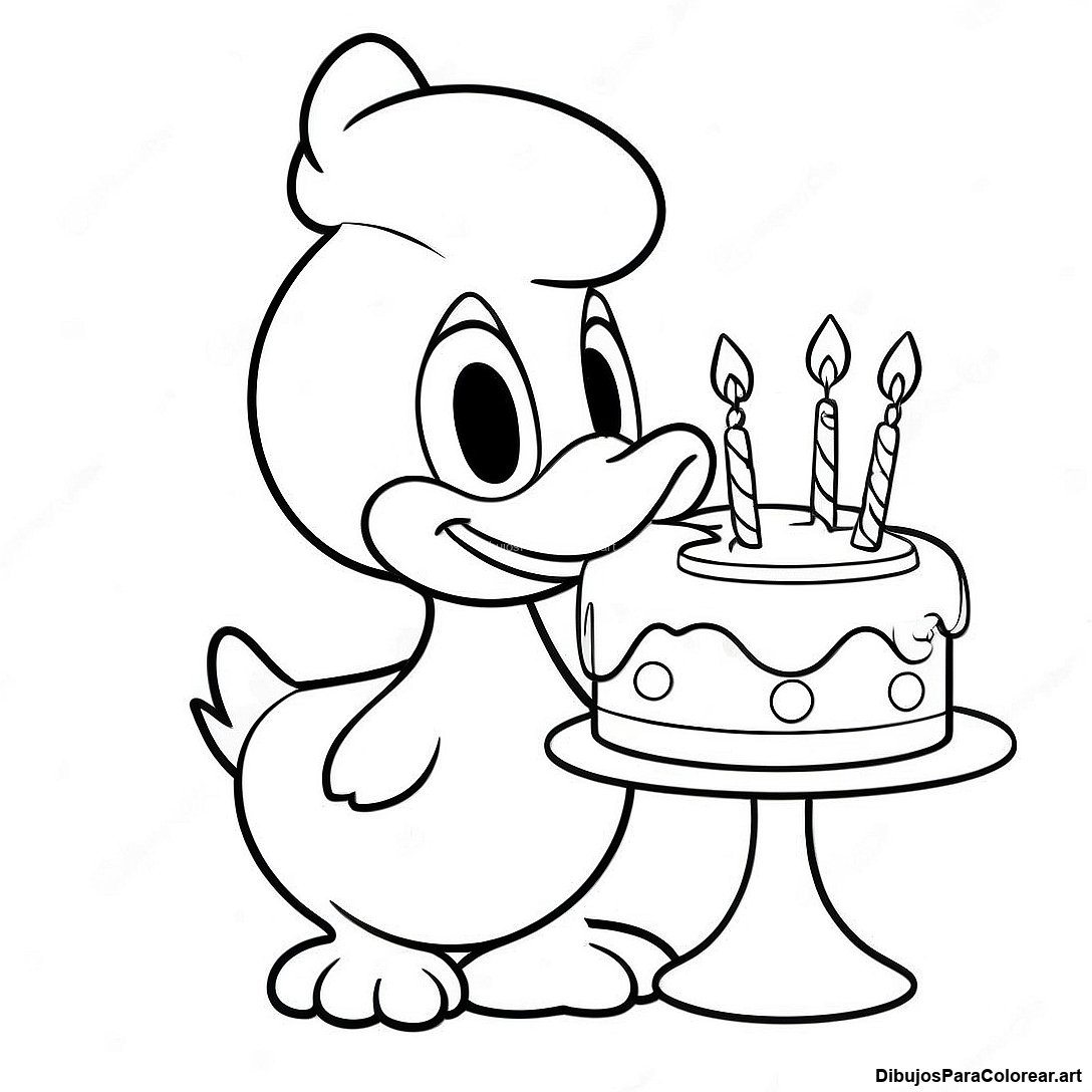 Descargar PDF imprimible de Página Para Colorear De Pato Donald Con Un Pastel De Cumpleaños