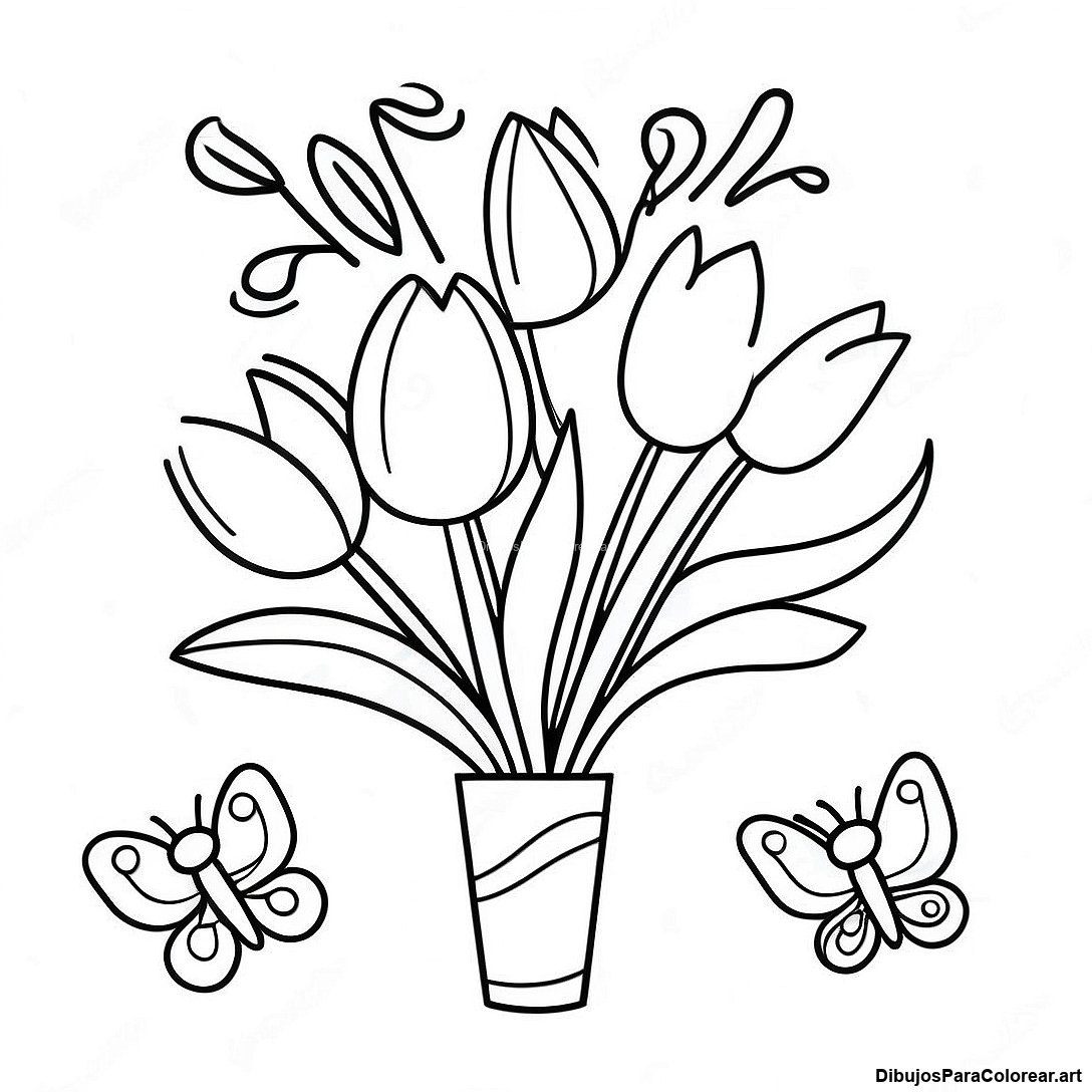 Descargar PDF imprimible de Página Para Colorear Ramo De Tulipanes Con Mariposas